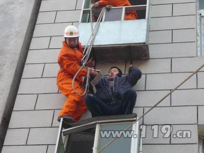 到达现场后,发现一男子双手抓着窗户两边的钢筋,双脚踩在铝合金窗户上,并且铝合金窗户一边已经被踩坏,该男子身体在不停地颤抖。据周围群众讲该男子已在上面困了近一小时,情况十分危险。现场指挥员当机立断,利用安全绳从四楼窗户救人,并在楼下不停地安慰被困者,让其保持镇定。
