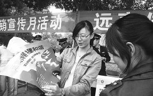 9月9日,一名来自宁夏大学的打击传销志愿者,向市民讲解非法传销的危害。当日,银川市工商局在全市开展了“打击非法传销宣传月”活动。