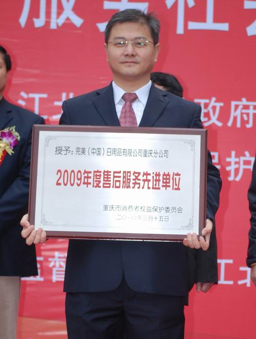 雨声、音乐声、喧闹声......汇集在一起拉开“3.15”颁奖仪式,完美重庆分公司凭借优质的产品质量与完美的售后服务,突出重围取得消费者认可荣获“2009年度售后服务先进单位”殊荣。