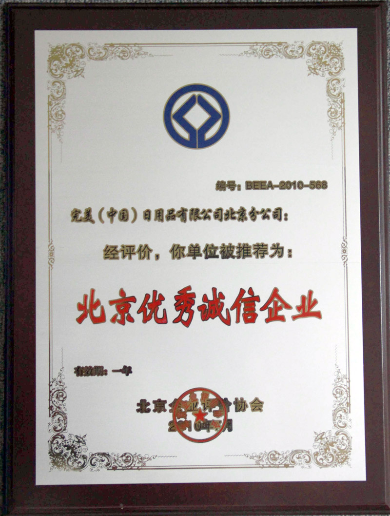 2010年7月15日“第二届北京企业诚信论坛”暨“北京优秀诚信企业” ﹑“北京优秀诚信企业家”﹑“北京优秀诚信品牌”表彰大会在西单商场会议大厅顺利召开。本次论坛由北京企业评价协会﹑北京市消费者协会﹑北京市价格协会﹑北京市场协会等8家协会共同发起,得到了中国企业评价协会﹑中国价格协会的大力支持。完美北京分公司作为优秀企业代表受邀参加此次论坛并荣获“北京优秀诚信企业”的荣誉称号。