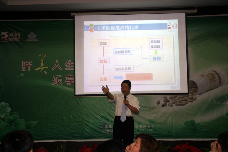 本次课程主要围绕玉米肽糙米胚芽片展开授课。首先是徐总监为大家讲解了“肽为何物?”以及公司的新产品,俆总监风趣、幽默而又不失严谨的授课方式赢得了学员们阵阵掌声;杜照平总监激情洋溢地为大家带来了“玉米低聚肽”。李卫东总监在后面的课程中向大家讲解了肝脏的功能重要性及玉米肽其他成份介绍,让与会者更明白 肝脏的功能及危害肝脏健康的一些危险因素。在问题答疑环节,四位总监现场为各位学员解答了很多学员在市场上遇到的问题。