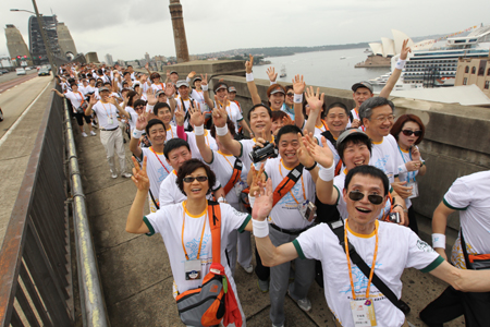 安利营销菁英正在步行经过悉尼海港大桥,以“慈善健康走”的形式捐助当地残障儿童