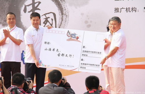 作为无限极2012世界行走日(中国)活动的新亮点,明信片已成为了每站传递健康传递爱的见证。在近万名行走市民的见证下,青岛市组委会代表于良仁先生向西安市人民政府副秘书长焦维发先生递交了寄语“山海本色,古都文行”的明信片。而当西安市人民政府副秘书长焦维发先生向无限极2012世界行走日(中国)活动下一站苏州市的代表——我司业务部总经理薛守春先生递交寄语“长安姑苏山水同秀,绿色健康你我同行”的明信片时,全场响起了经久不息的热烈掌声。