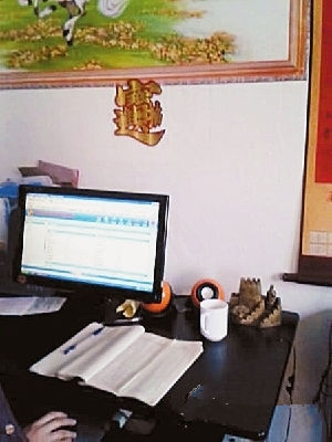 电脑上面贴着“招财进宝”,电脑里面记着“招”了多少财“进”了多少宝